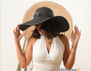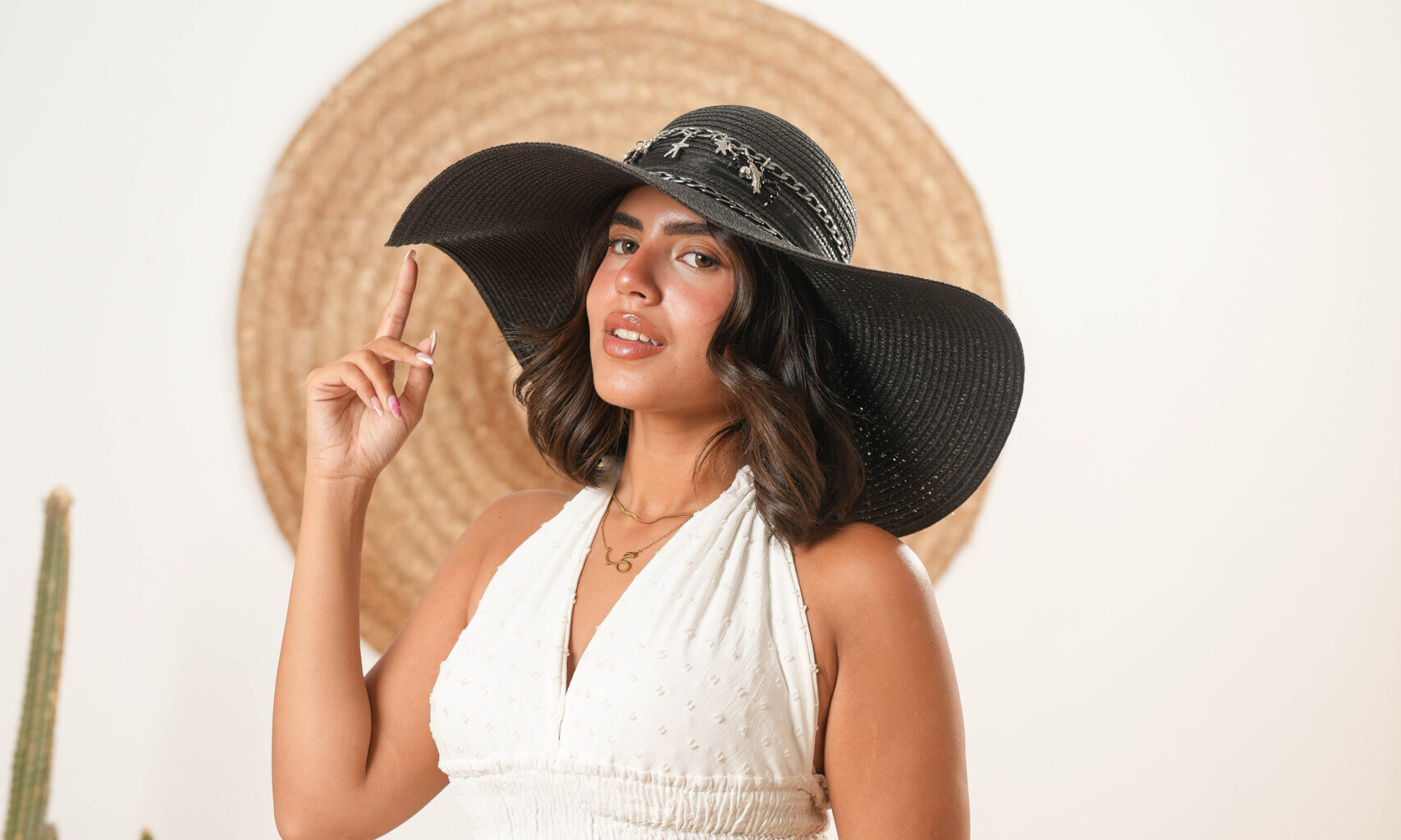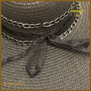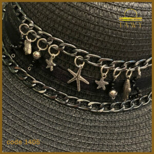 A bold oversized black hat decorated with sleek silver & black chains, featuring a simple yet elegant touch of fish and starfish charms. Unique, stylish, and designed to stand out. 100% Egyptian made with authentic handmade craftsmanship, blending modern fashion with seaside inspiration.